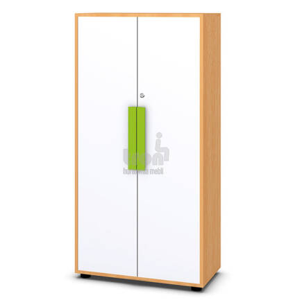 Szafka szkolna z 2 drzwiami. Wymiary 1580x800x400. Wykonana z płyty laminowanej o grubości 18 mm. Krawędzie oklejone obrzeżem ABS 2 mm. Wewnątrz 3 półki. Zamykana na zamek. Uchwyty lakierowane.