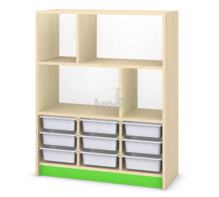Średni regał przedszkolny, cena bez pudełek, wymiary 1240x1000x400, wykonany z płyty laminowanej o grubości 18 mm, oklejony obrzeżem ABS 2 mm.